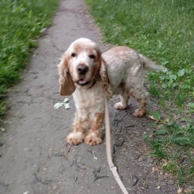 8 latka w typie spaniela. Ufna, grzeczna, niepoprawna pieszczocha, gotowa pójść za człowiekiem na koniec świata. Po prostu kocha ludzi – dużych i małych. Jest cicha, dobrze wychowana. Bez problemu zostaje w domu sama. Zachowuje czystość. Przepada za spacerami i doskonale umie chodzić na smyczy. Nie peszy jej miejski gwar. Spokojna, zrównoważona, grzeczna. Nie dogaduje się z suczkami, z samcami natomiast bez problemu. Zdecydowanie lubi tropić i jest to umiejętność, którą można z nią szlifować podczas szkolenia. Szuka domu raczej bez gryzoni i ptaków (takie geny ;-) ). Wspaniała, ujmująca, kochana, bezproblemowa.